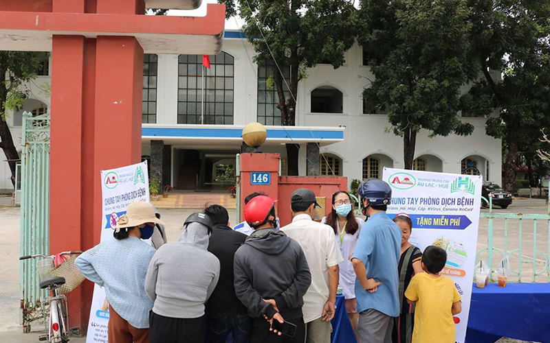 Học là để có kiến thức và vận dụng được kiến thức đã học để tạo ra các sản phẩm cụ thể phục vụ cho xã hội và cộng đồng, hơn 200 sản phẩm sáp khử khuẩn và nước rửa tay đã được chính các em học sinh điều chế với sự hướng dẫn của Quý Thầy Cô của Khoa Y – Dược, Trường Trung cấp Âu Lạc đã được tặng miễn phí đến tận tay từng người dân Huế. Từng nụ cười, lời cám ơn của các Anh, các Chị, Chú, Bác và cả những lời khen – đã giúp các bạn học sinh Nhà trường sung sướng ngất ngây cũng như có thêm động lực để tiếp tục con đường đầy ý nghĩa mà các bạn đã chọn học: Trở thành cán bộ nhân viên trong khối ngành chăm sóc sức khỏe cộng đồng.